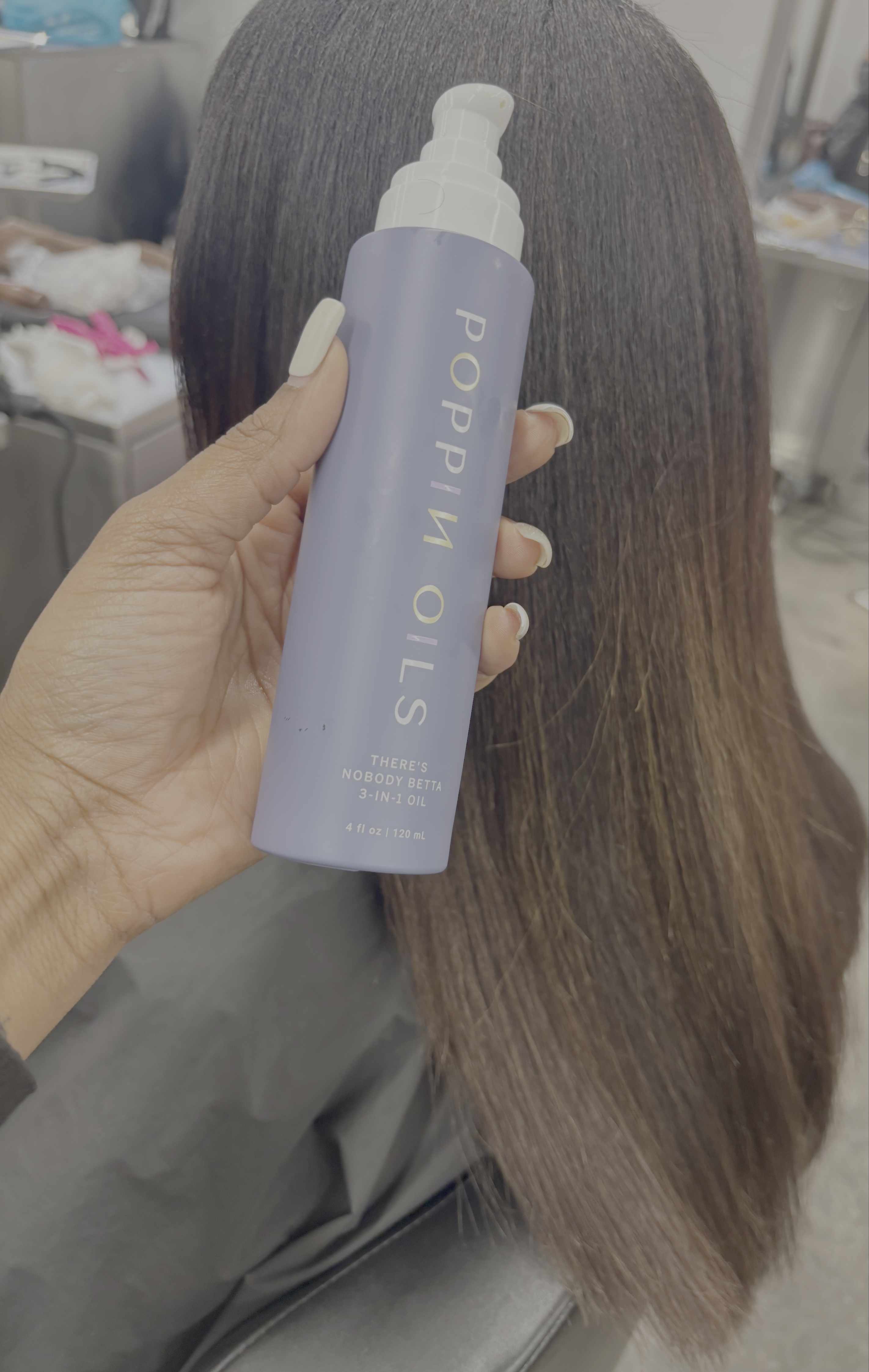 Poppin Oils 3-in-1 is strong enough for your hair and safe enough for your skin. Formulated to deeply moisturize dry hair, scalp, and skin — without feeling greasy or heavy. Our lightweight, multi-purpose oil absorbs beautifully into the hair shaft to soften, add shine, smooth frizz, combat dry itchy scalp, provide up to 450 degrees of heat protection and support your everyday hair and skin needs.